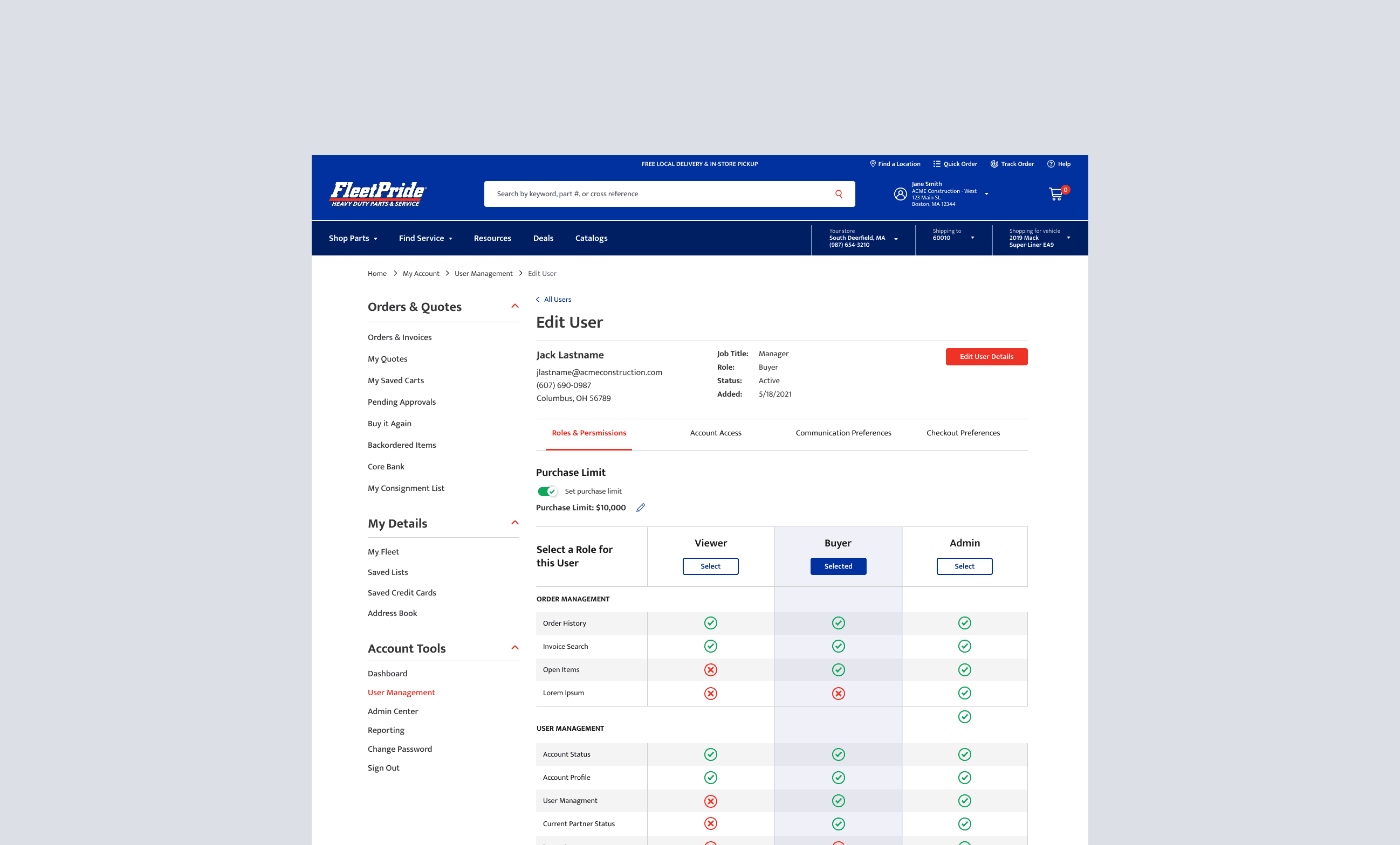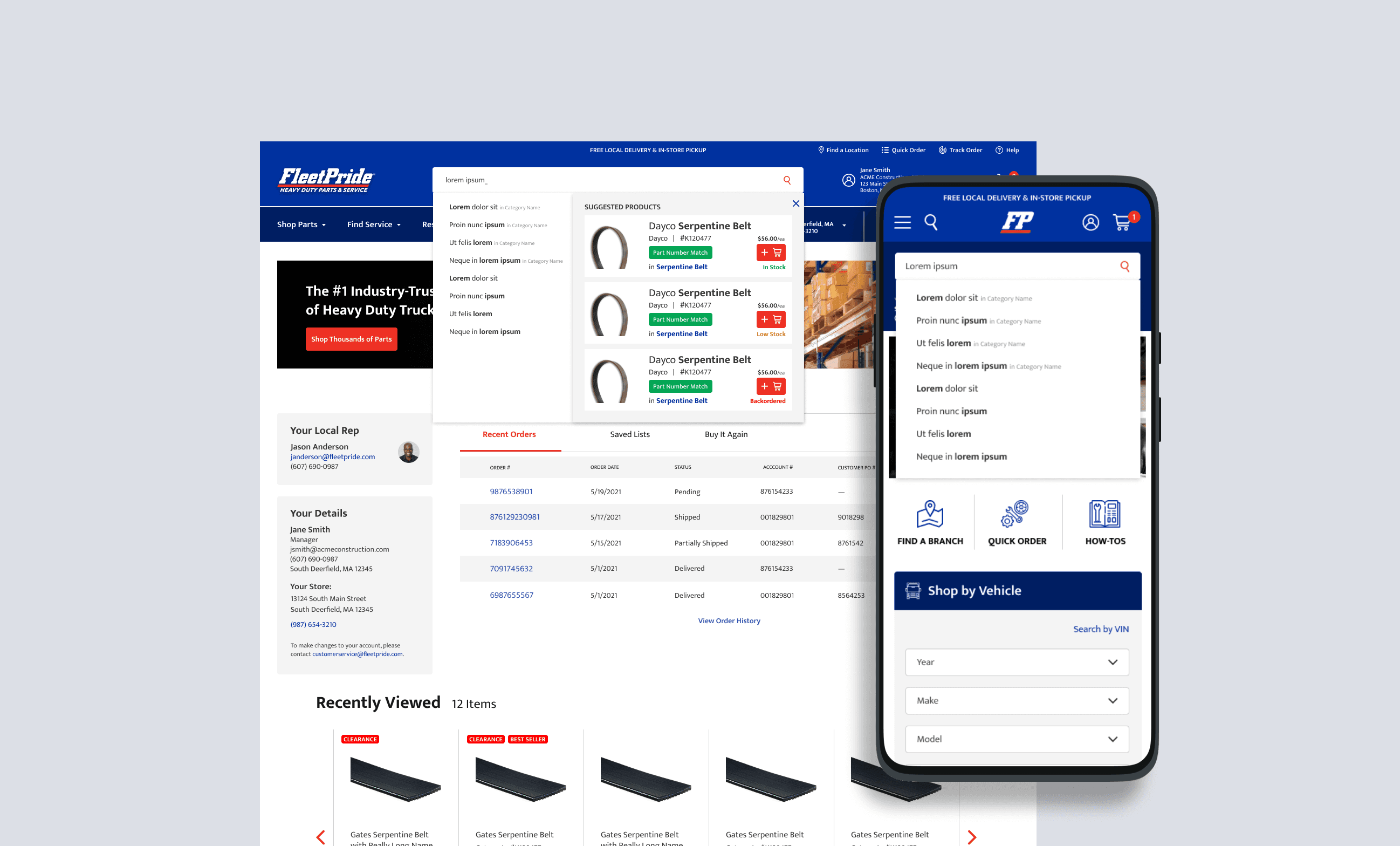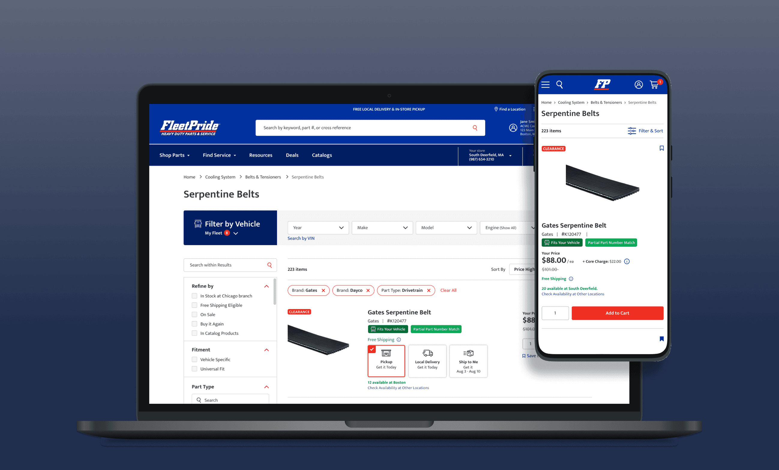 FleetPride, a leading distributor of heavy duty truck and trailer parts as well as maintence provider for the heavy-duty truck industry, needed to enhance their digital experience to meet the needs of the modern customer by exanding their customer user management capabilities and streamline the path to purchase. Due to the nature of FleetPride products, leveraging fitment data and providing feedback to the user in realtime as to the compatibility of the part they are searching for was extremely crucial. End customers needed to be reassured throughout the browsing process that the part they are looking for would be compatible with the vehicle that they are looking to service. FleetPride also needed the ability to build out a single cart with products that would be sourced from a variety of locations based on product availability and user preference.