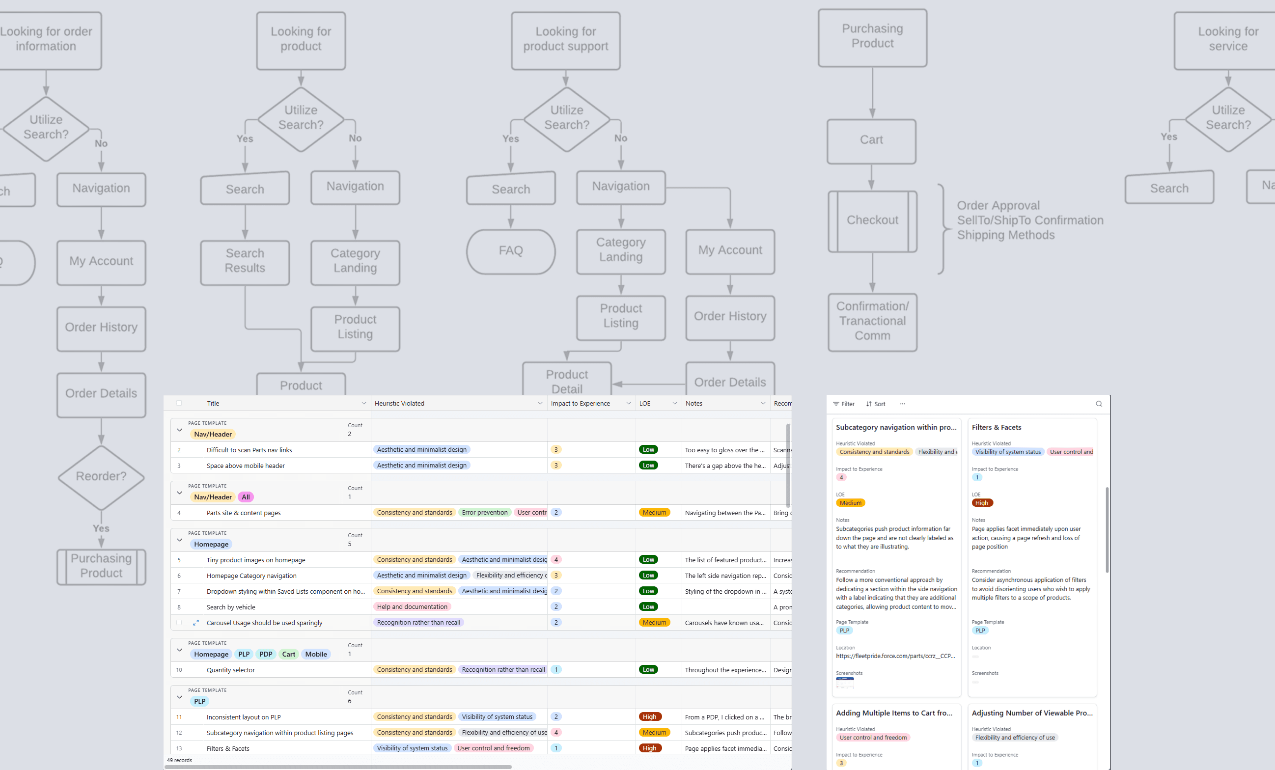 We began with multiple discovery workshops to build a competitive landscape for FleetPride, assessing what users within the industry are interacting with through the course of business. We used this landscape as a backdrop for our heuristic analysis, identifying areas for focus during our redesign and rebuild process. By establishing a priority matrix, we can focus on high return areas to maximize the efficiency of our efforts. We also engaged directly with customer service representatives as well as customers directly to identify areas of focus.